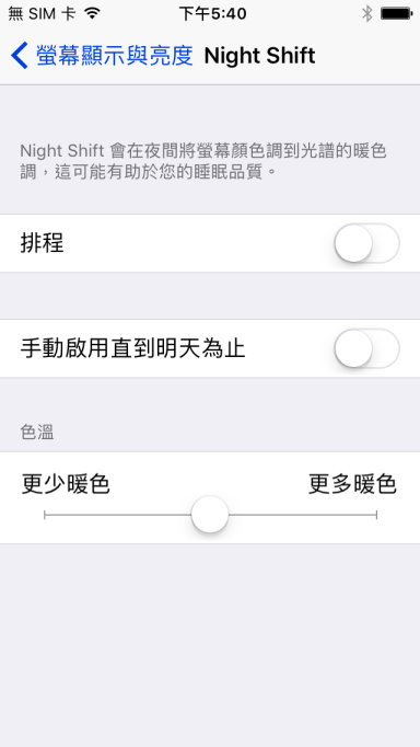在IOS9以後,有在設定>>一般>>亮度的下方,night shift,可以手動調整色溫,當然也可以下載app,去調整螢幕色溫。