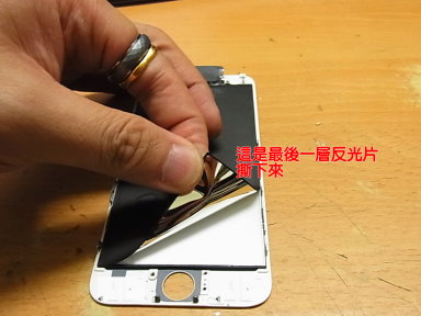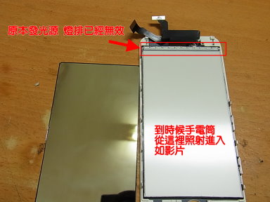 拿手電筒照正面,勉勉強強,還能看到鍵盤位置,輸入開機密碼,但還是好暗,為了客人的商務資料轉移到新的手機,只好拿一片螢幕把液晶後面的反光片撕開,直接用手電筒當做原本的手機發光燈排,這時候桌面清楚的不得了。