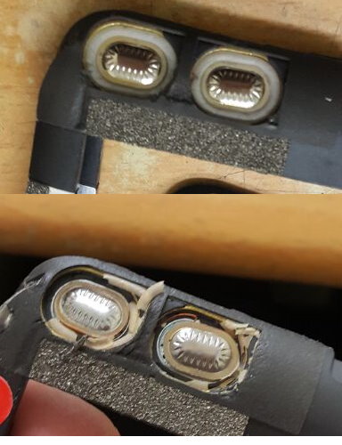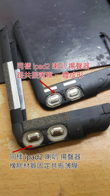 這兩年開始 2016、2017,每個月都可以見到客人的ipad2 ipad3喇叭出現破音,我們進的料也都是全新的(但這生產年份都已經甚久)換上去之後都正常,但客人使用兩三天後,又出現破音,換下一個新的喇叭,也是使用個兩三天又破音....。百思不得其解,後來比對料件,才發現有兩種規格,而橡皮固定共振薄膜的規格也只有出現在ipad2、ipad3,而ipad4後,就沒見過這類橡皮圈。