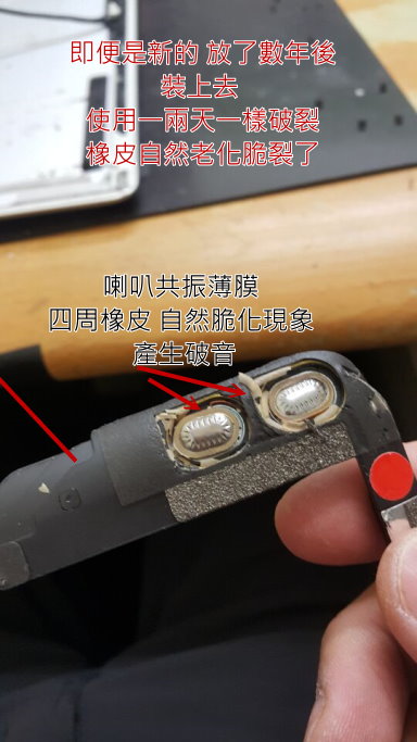 橡膠材質的自然脆化,就算是全新的,放到現在也七八年,橡皮一樣都脆化掉了,外觀看似完整,喇叭共振個幾次整個橡皮就脆化的一塌糊塗,又會出現破音,只能由我們維修的業者自己放大眼睛挑一體成形材質的共振薄膜,否則真的會處理不完。