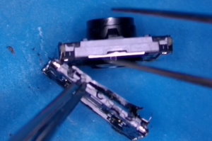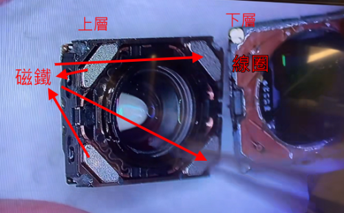四、打開相機,無法對焦,線圈跟磁鐵之間無法正常運作,通常都是有斷線(可以思考為馬達的結構,馬達會動就是線圈導電後加上磁鐵,但相機那麼小根本無法裝入馬達,卻可以依舊做微距前後伸縮,所以有專有名稱:【音圈馬達】、【磁動框架】)